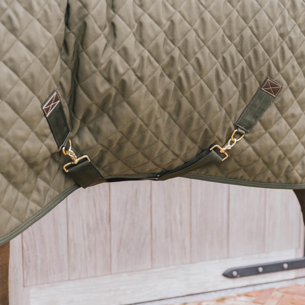The buckles are made from stainless steel and therefore do not rust. The straps on the show rug are made from the same webbing as seatbelts and which makes them extra strong. The brass finish on the buckles and the artificial leather patches make the Show Rug look very chic.