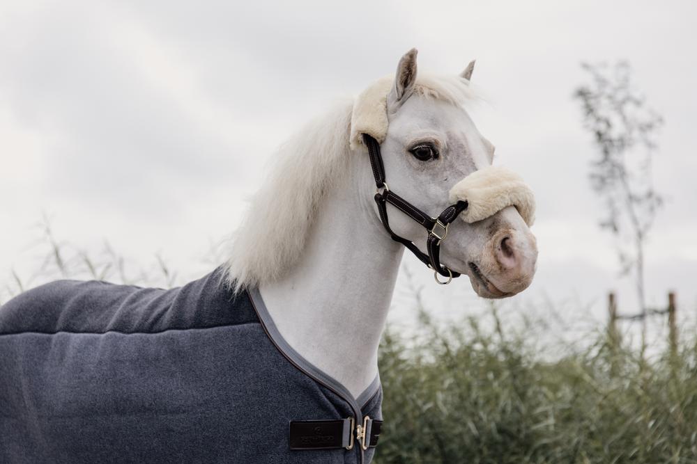 The rug is highly absorbent and quickly wicks away sweat or water. The added vegan sheepskin on the wither provides extra comfort. The rug is finished with vegan leather piping and elegant front closures.