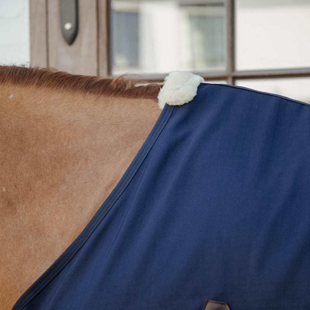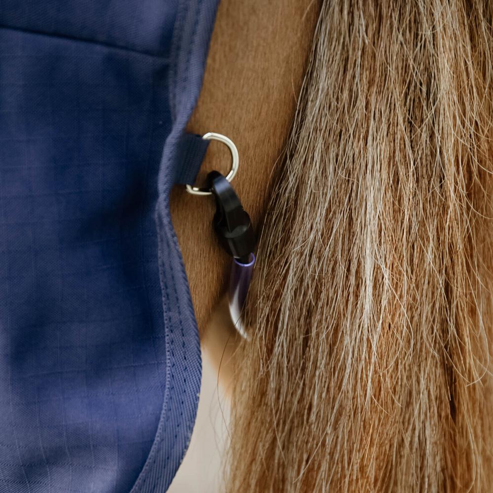 The outside of the stable rug is made of a 900D Ripstop polyester. Ribstop fabric is a fabric that contains reinforced yarn, that makes it incredibly hard to tear the rug. Another benefit of this fabric is that it’s shavings repellent, so you can easily brush hay and straw off the rug. The filling is made from a fiberfill, which has the same performance as down without absorbing any smell. The inside lining of the rug is a micro-polyester fiber, which has a soft cotton touch.
