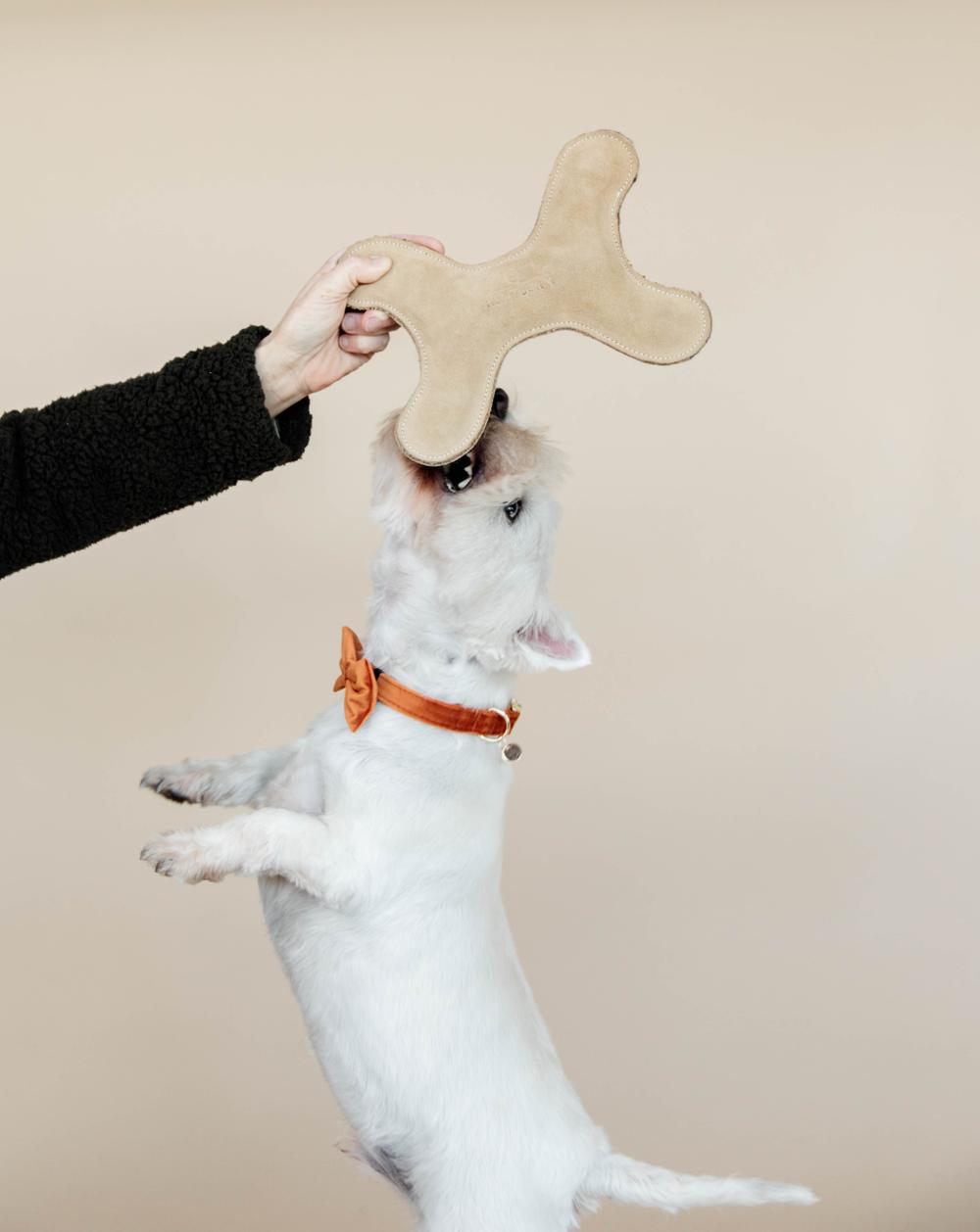 It’s playtime! The dog toy pastel bone is perfect for dogs who love playing fetch or a game of tug of war. Thanks to the squeaker on the inside, the toy is very entertaining. To prevent the toy from losing its shape, the inside is filled with jute.