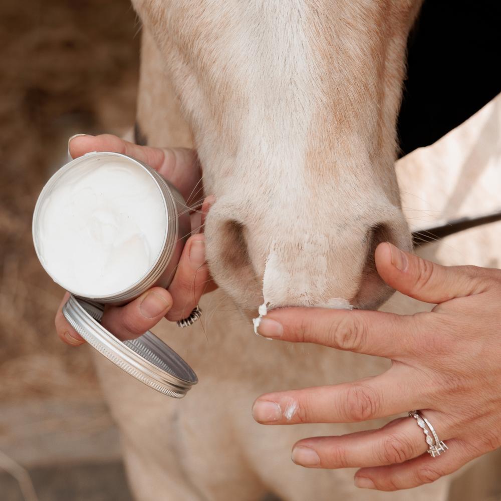 Apply a generous layer of Sunblock to vulnerable areas such as the horse’s nose, pasterns, and other exposed skin before sun exposure. Reapply if the product is washed off, although the water-resistant formula ensures long-lasting protection.