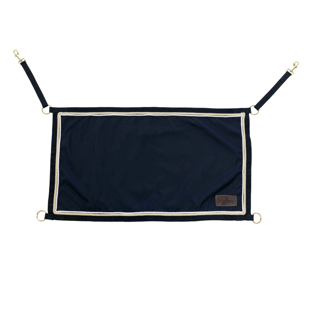This Stable Guard has two reinforced gold colored rings in the upper corners with a nylon strap with a snap hook to attach to the stable. There are two more reinforced rings in the bottom corners to attach the Stable Guard. It has double ropes which give a general outstanding look. Create a unique appearance by embroidering your own logo . Match the stable guard with the Stable Curtain Classic and the Stanley Cover Classic for an exceptionally smart look.