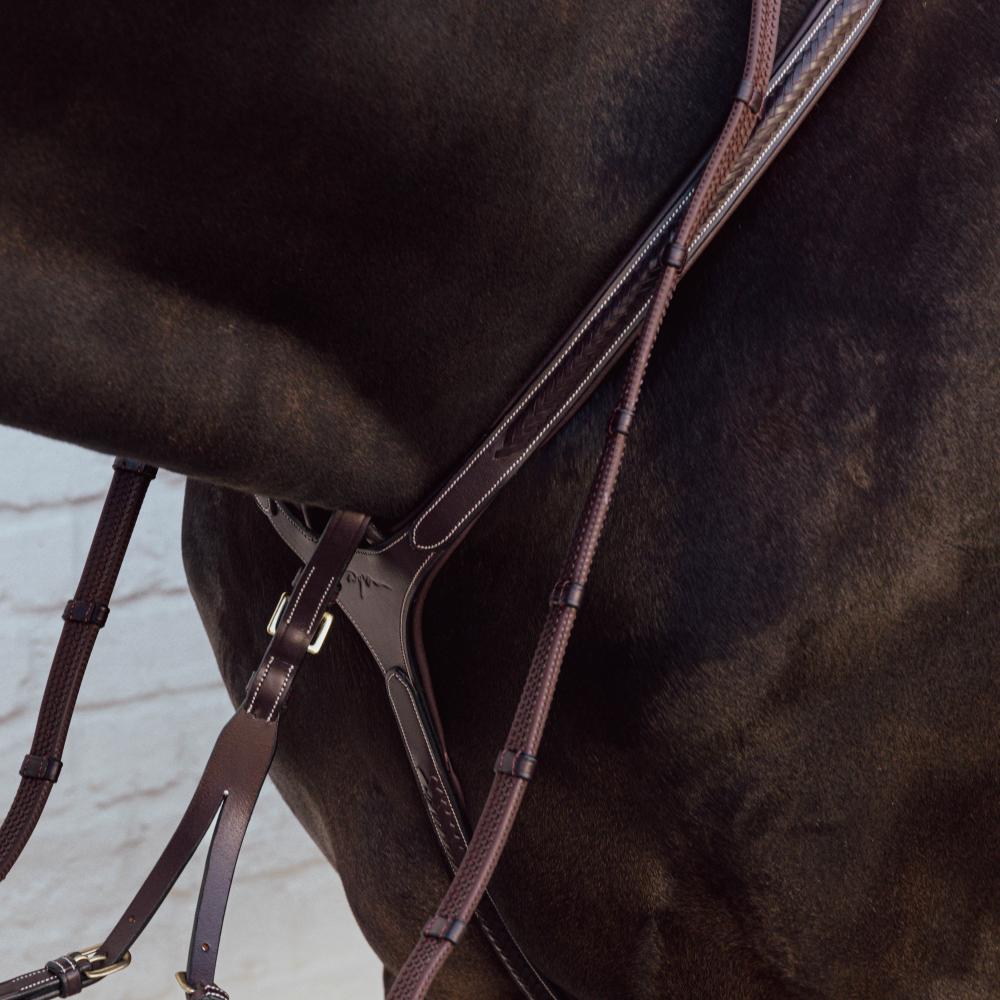 The Breastplate is part of the D collection, which means the color of the stitching is cream. The buckles are brass. Available in brown and black.