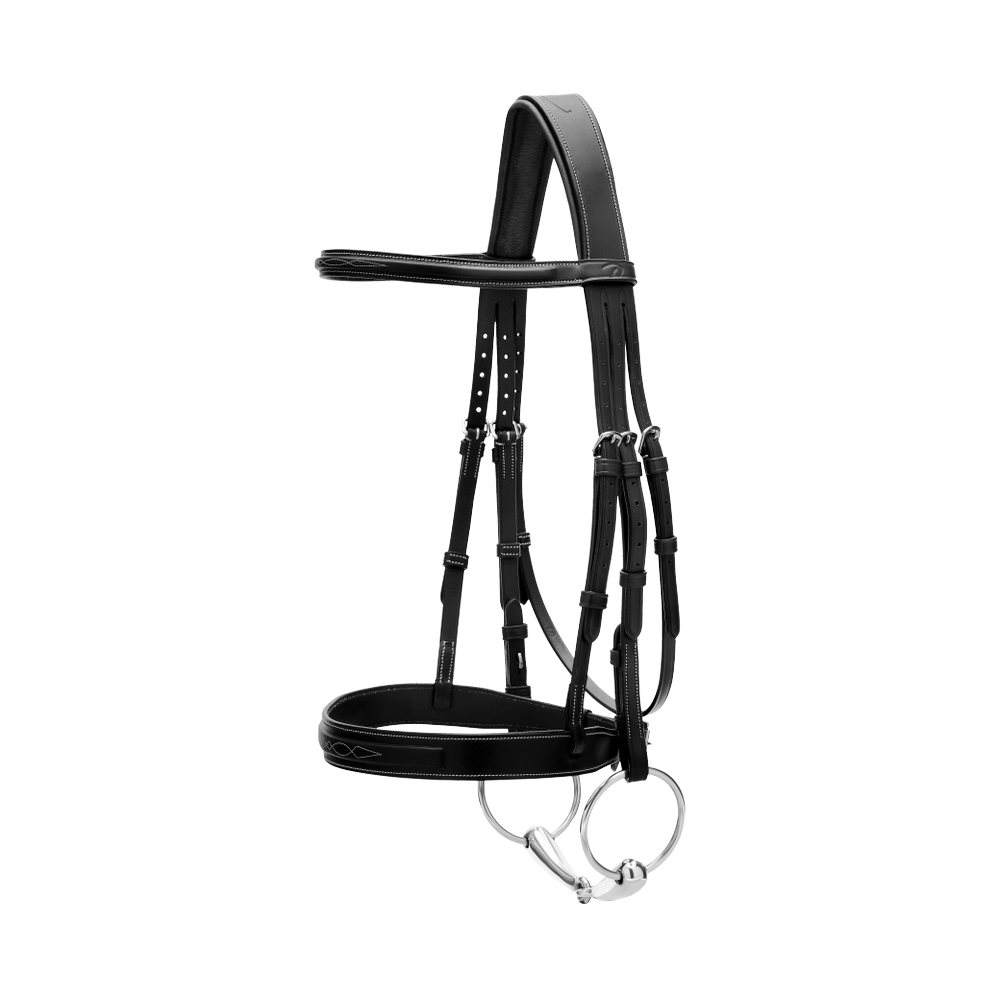 Cavesson Hunter Noseband Bridle with Dy’on 3-strap headpiece Slightly square- raised noseband and browband with decorative topstitching Browband without padding with hot stamped logo Wide cavesson noseband