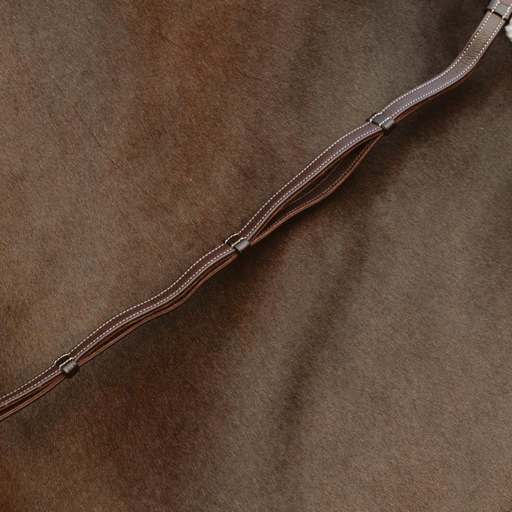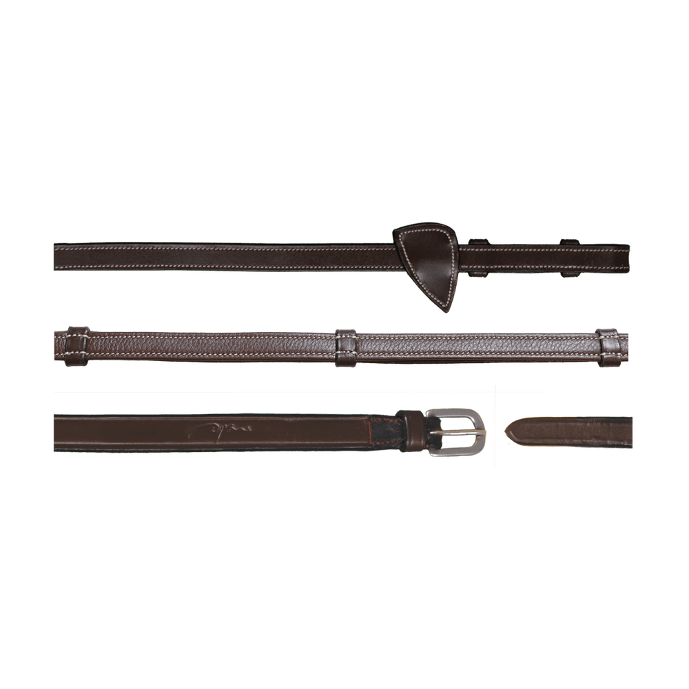 The reins are part of the Working collection, which means the color of the stitching is cream. The buckles are stainless-steel. Available in brown and black.Â