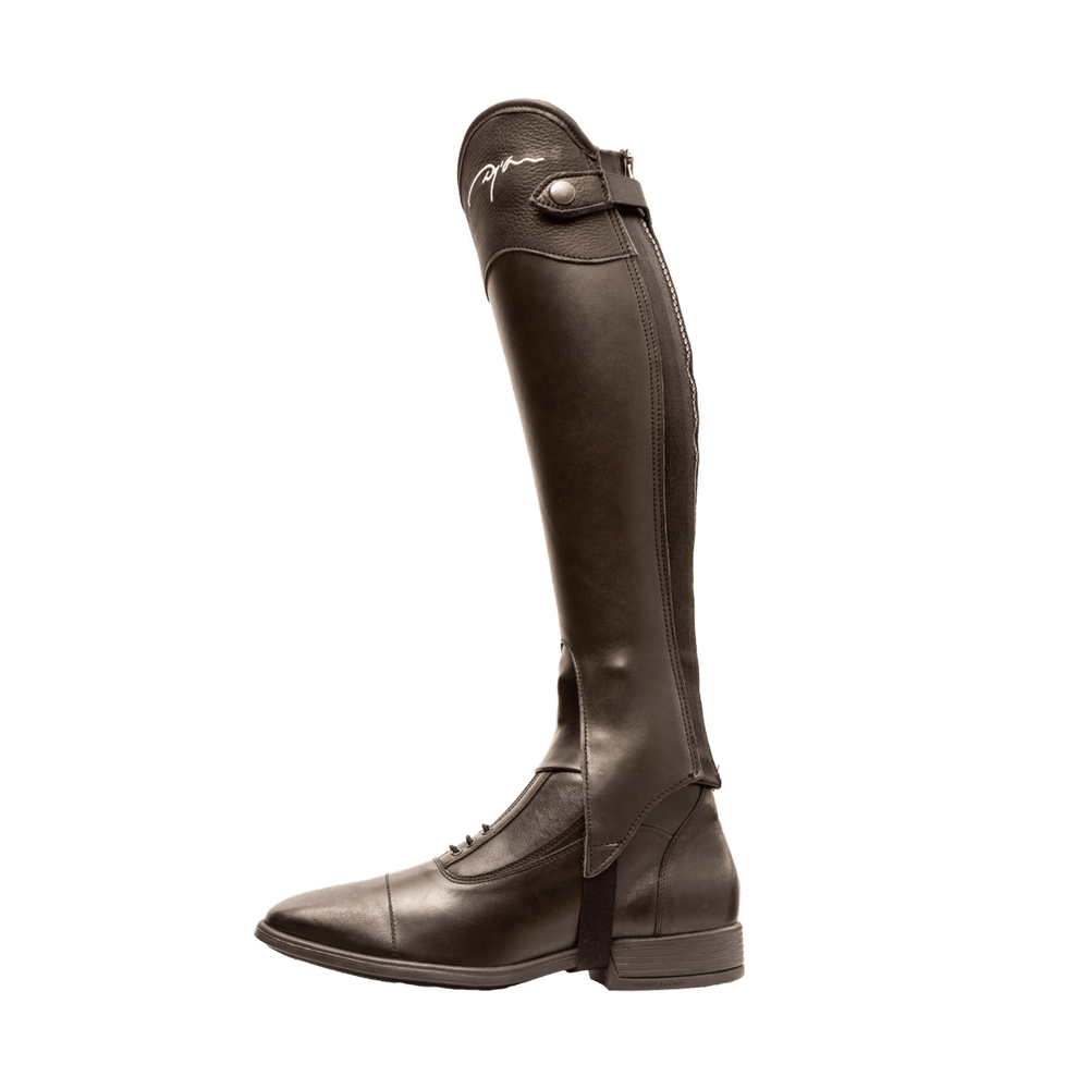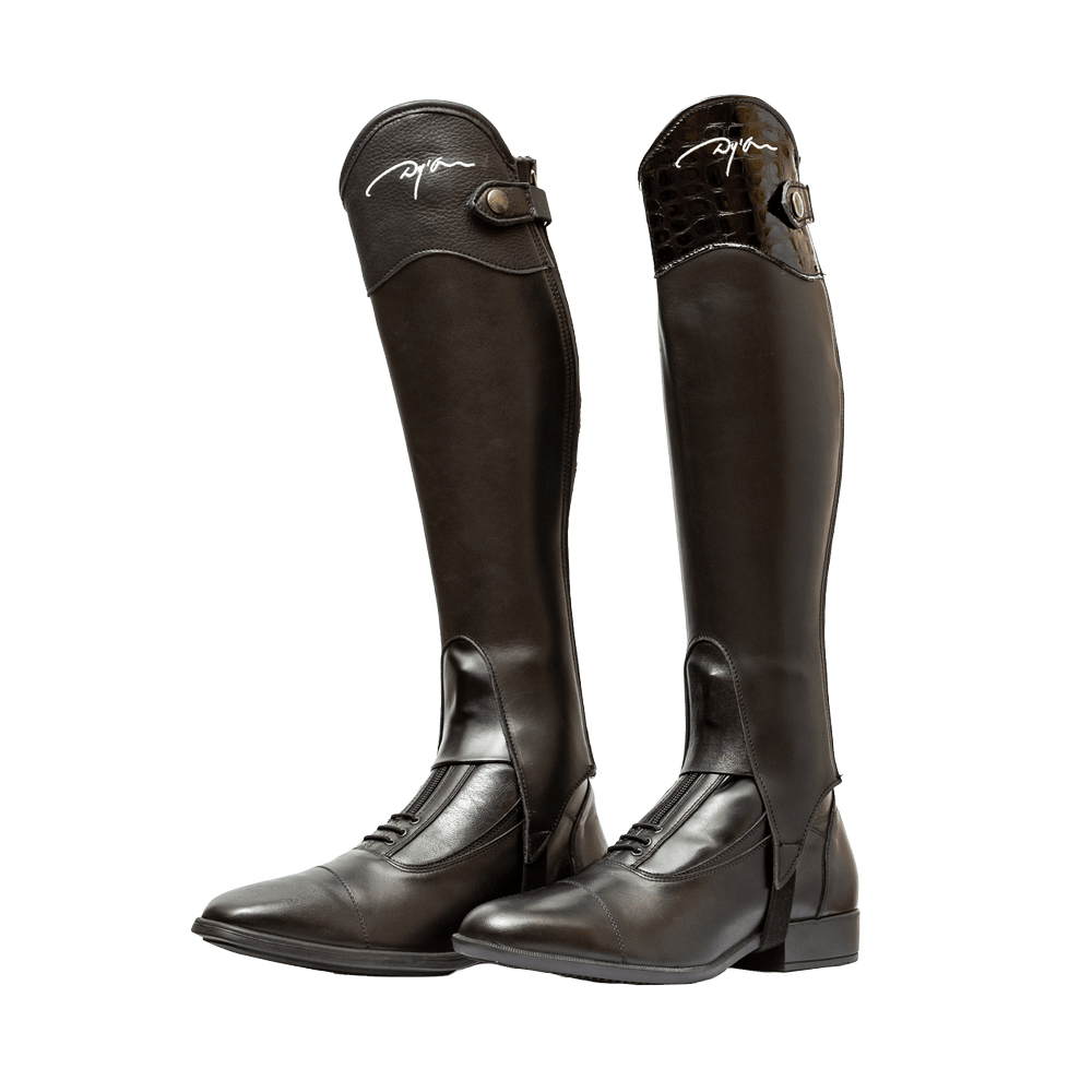 Half chaps in Smooth calf leather (Thickness 1.8 mm) with nylon YKK zip fastener and elastic strip along the back of the leg.Unique design cut to release the instep with gusset in elastic leather, elastic strap under the knee and elastic under feet.The Exel half-chaps top have a Dyon logo embroidery and can be in grained leather or in patent faux croco.The Exel half chaps exist in standard size