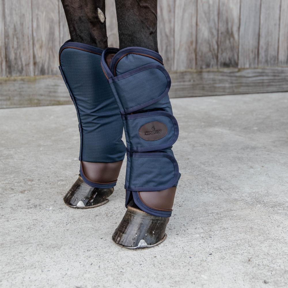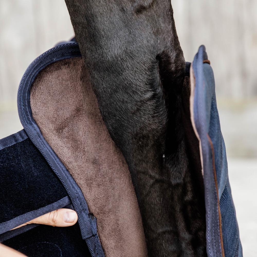 The outside of the travel boots are made from a strong 600D ripstop polyester. Ripstop is a special weaving technique that makes the fabric more resistant to tearing and ripping. The pastern area is reinforced with Kentucky’s artificial leather. Therefore, the sensitive heel zone is extra protected. The travel boots are lined with artificial rabbit skin. Next to increased comfort, the artificial rabbit skin avoids rubbing marks and regulates the leg’s temperature. A shock-absorbing foam is added inside the boots to offer maximum protection. All these materials are lightweight, breathable, long-lasting and ensure your horse’s wellbeing whilst traveling.
