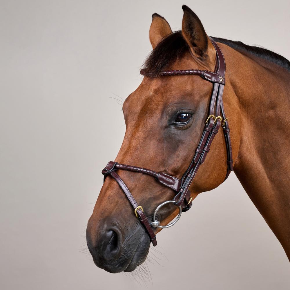 This bridle is part of the Dy’on collection which means it has cream stitching and brass buckles. There are round braided leather details on noseband and browband. Available in brown and black.